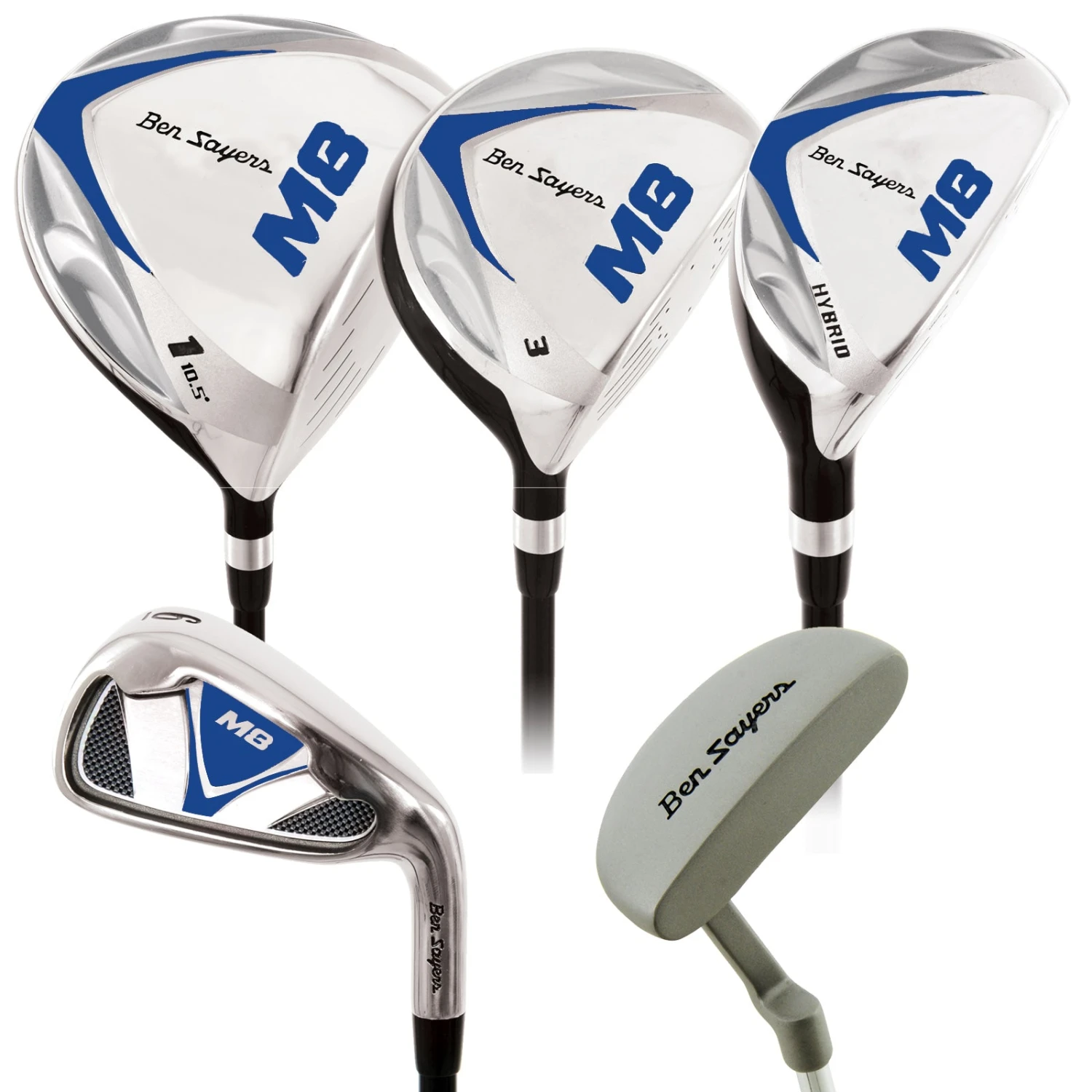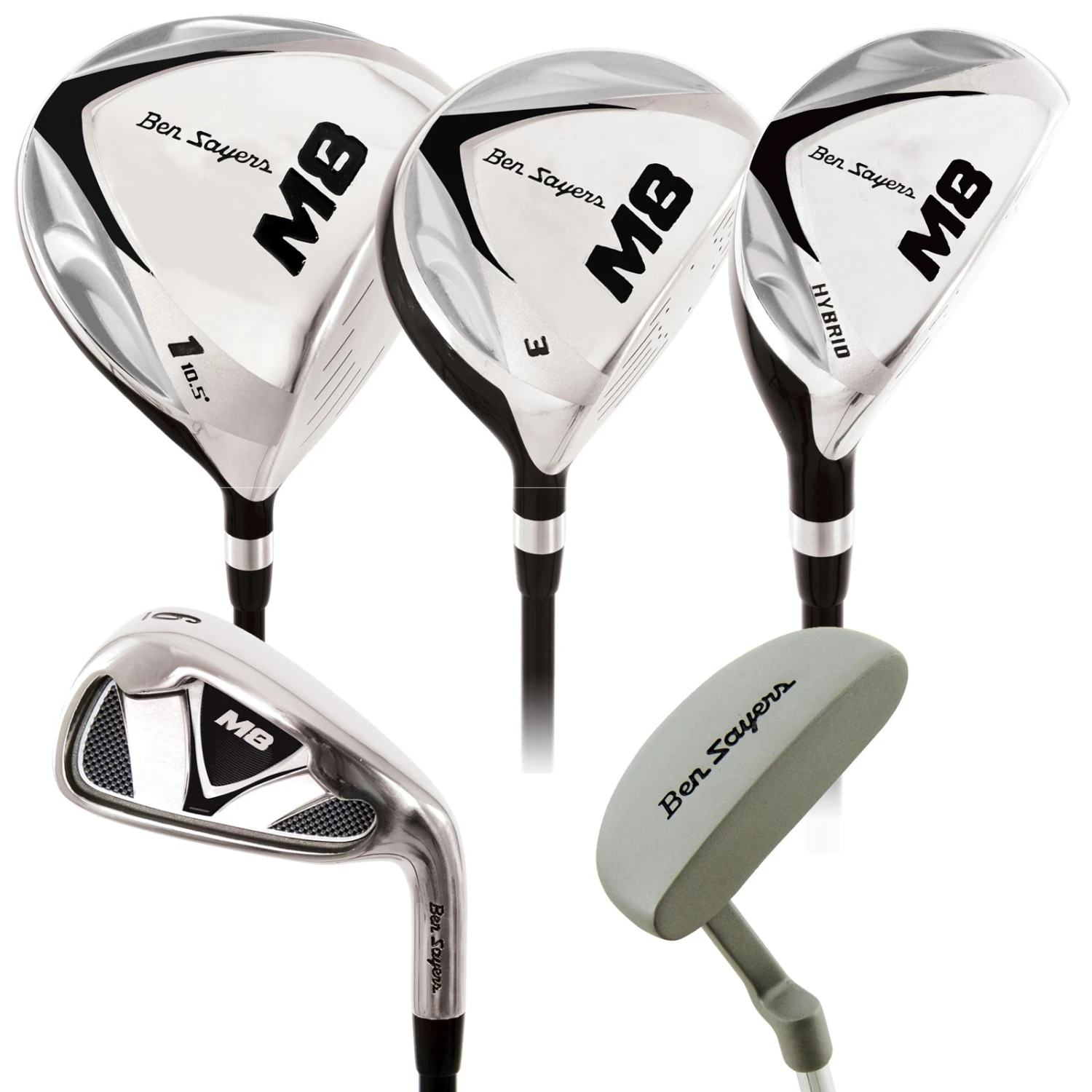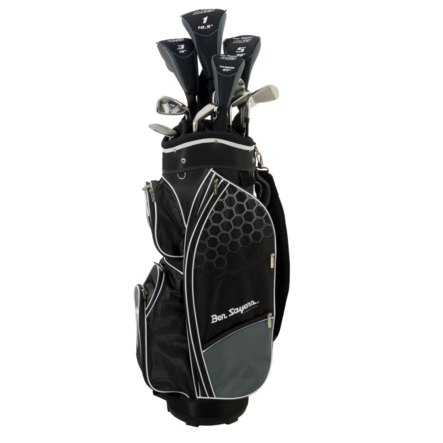 - Full set comes with: driver (10.5° loft), 3 wood (15° loft), 5 wood (20° loft), hybrid (23° loft), iron set (5-SW), putter & cart bag.