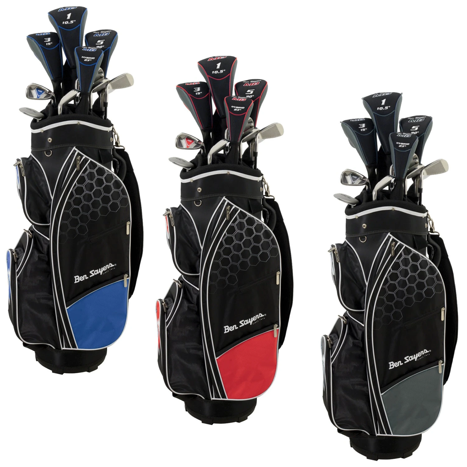 The Ben Sayers M8 Package Set has been created and engineered to provide the beginner golfer will the tools to learn the wonderful game of golf and progress quickly. Ben Sayers have put together a configuration of clubs that will benefit your ability and work with you over the course of the next few years as you progress and get better. All woods have been fitted with a lightweight graphite shaft that will allow you to swing the club effortlessly faster to generate more distance without sacrificing accuracy. The irons features a lightweight steel shaft to offer an incredible blend of distance, accuracy and forgiveness. You also get a choice of golf bags with the M8 package set. If you are going to carry the majority of the time then go for the lightweight stand bag option but if you can see yourself using a trolley then go with the cart bag option.