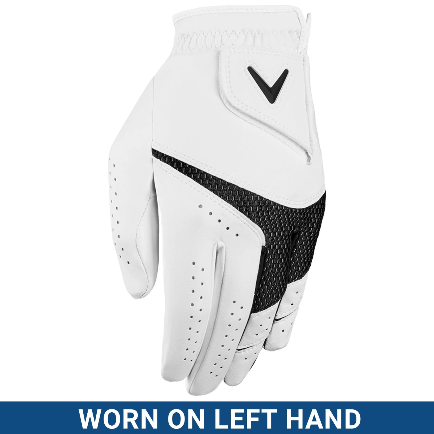 - Left hand glove, worn by a right-handed golfer.
