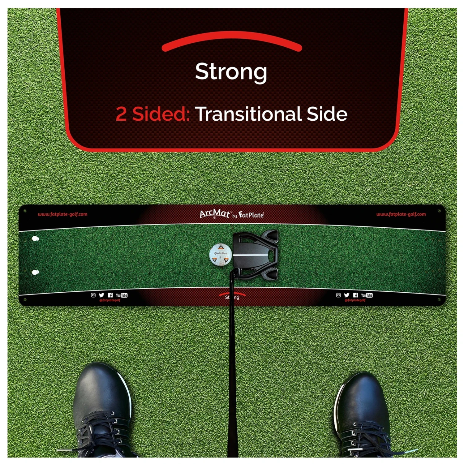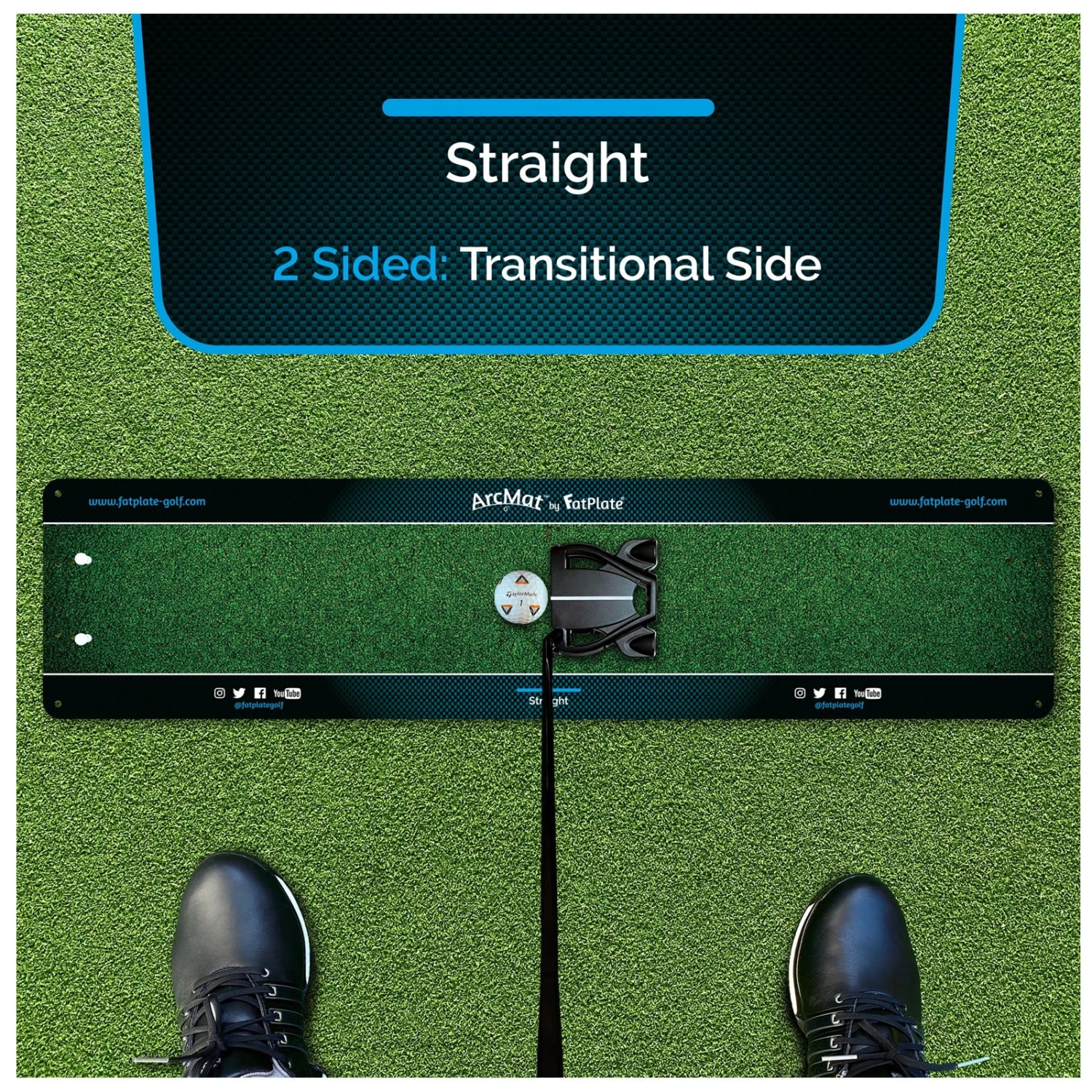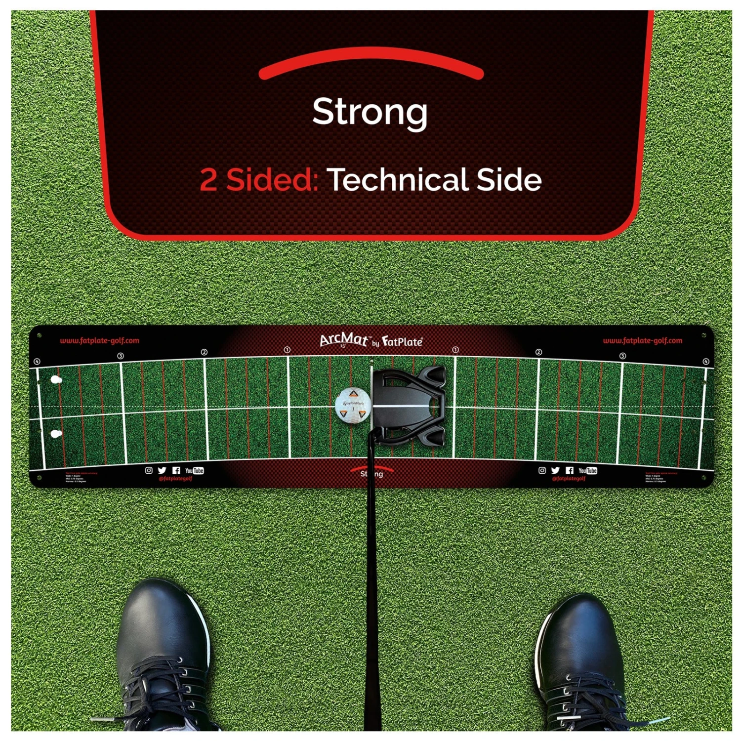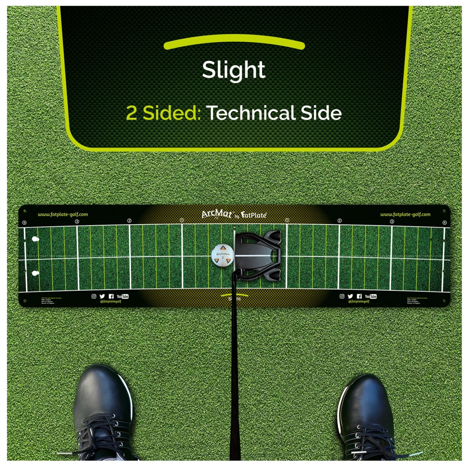 ArcMat’s (Technical side) stroke track contrast gives you a strong visual pathway within which to move your club whilst the sweetspot arc, stroke track & numbered face angle lines give complete guidance throughout the stroke. By removing the sweetspot arc, face angle lines & square face setup line, ArcMat’s transitional side then becomes the perfect bridge between technical training & the natural appearance of the green.